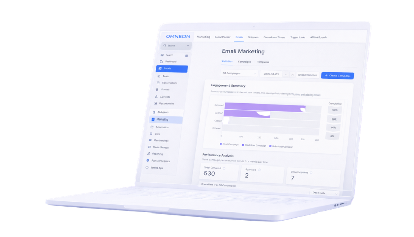 OMNEON centralise tous vos outils marketing en une seule plateforme : site, rendez-vous, emails, paiements, messages, CRM.